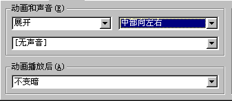这时 “效果”选项卡处于打开状态,单击“动画和声音”选项组中第一个列表框的下拉箭头,在列表框中列出了几十种动画效果的名称,我们选择“展开”,然后在其右边的列表框中选择“中部向左右”选项,(如图3)