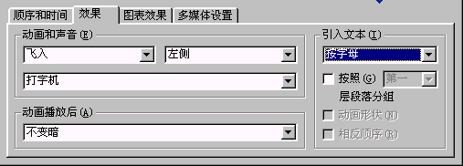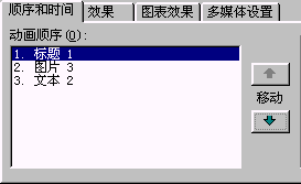“按字母”是引入文本的方式,利用它可以更细致地设置文本的动画。比如刚才的“飞入”动画,如果在引入文本中选择“整批发送”,整个文本框中的内容就会一下子全“飞入”进来;如果选择“按字”,那就会按词组飞进来;如果选择“按字母”,那就会一个字一个字地飞进来。但是标题后出现有些不太好,所以要调整出场顺序。单击“顺序和时间”选项卡,在“动画顺序”一栏中,我们可以看到,“标题1”处于第三位,所以会后出现。选中它,点一下旁边的向上的箭头