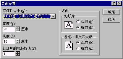 如果你把纸张设得太小,就要对幻灯片做出相应的调整,不然字就会排得乱七八糟。在“幻灯片编号起始值”栏中还可以设置幻灯片的编号从几开始,如果你的幻灯片一共有五页,包括一个封皮,四页文稿正文,这时你不想让封皮算作页数,就可以在“幻灯片编号起始值”一栏中填入“0”,这样正文就从第一页开始了。如果你的文稿只是整体文稿的一部分,你就可以把起始值设成想显示的页号,比如从17页开始。在“方向”区域中,可以设置“幻灯片”、“备注页、讲义和大纲”的显示和打印方向,可以设置成“纵向”或“横向”。演示文稿中的所有幻灯片必须维持同一方向,即使幻灯片设置为横向,仍可以纵向打印备注页、讲义和大纲。