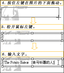 | PowerPoint 97 |  |  一 创建演示文稿 1.PowerPoint97简介 2.放映一个演示文稿 3.创建演示文稿 4.确定母版 5.插入剪贴图片 6.插入图片 7.图片的边框和阴影 8.插入文本框 9.使用视图观看效果 10.保存文件 二 基本操作与工具的运用 三 制作一份产品简介 四 一些高级功能的使用 | | | 第一章 创建演示文稿 第八节 插入文本框 最后的一步是插入文本框,打开“插入”菜单,将光条移到“文本”,在浮动菜单上单击“文本框”。 | 这时,鼠标箭头变为左箭头,按住左键在图片的下面拖动,在出现的文本框里输入“The Potato Eaters [食马铃薯的人]”,最后将文本框摆到适当的位置。 依此插入另外两张幻灯片上的文本框,分别输入“The vase with 12 sunflowers [向日葵]”和“Still Life With Four Sunflowers [四个向日葵]” 然后调整文字的大小和字体:我们把鼠标移到要调整的地方,选定文字,,选定的文字会反色显示,打开“字号”选单,选择24字号。然后将这三个文本框放到三张幻灯片的适当地方。 | 上一节 下一节 |