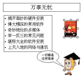 通过“工具”栏上的“复制”和“粘贴”按钮,复制五个同样的矩形,这样能保证它们的大小、颜色和动画完全一样,依次在每个方框中输入文本“展示组装电脑的方法与技巧”、“ 解决各种各样的难题”、“ 数十种工具软件的用法”、“ 跨入多媒体世界”、“ 各种软件安装的方法”、“ 用Internet与世界相联”。