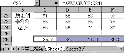 2) 函数的应用 现在我们求每名学生的总分和各科的平均分。C26中填入“=AVERAGE(C2:C24)”,意思是求单元格C2到C24的平均值。