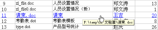 | 文秘篇(潇洒白领) ——文档管理 3)制作文档管理表 在EXCEL环境中,我们可以建立一个工作表,用来管理公司的常用文档。这是按照一定格式输入完成的文档管理表。  文档中包含文件名、内容、编写、文档页数和日期等内容,您还可以根据需要,加入“密级”、“发送单位”、“备注”等项目。下面按一定的顺序列出文档的详细信息,注意,“文档内容”项中应尽量包含文档的关键词,以便于查找。为了方便文件的总体控制和编辑,我们为每个文件做个链接。选中“请柬.doc”单元格,然后单击鼠标右键,选中“超级链接”命令,在弹出的对话框中,单击“文件”按钮,在“查找范围”列表中找到文件所在路径,选中“请柬.doc”文件,单击“确定”按钮,再单击“确定”按钮,退出对话框。  此时文件名变为蓝色,并带有下划线,当鼠标移动到该文件名上时出现小手状光标,单击该文件名,就可以直接启动WORD,打开该文件,进行所需的各项编辑操作,完成编辑后退出文档的编辑环境,就返回到文档管理表中。  下一节(文档管理表的使用) 回到页首  谈谈您的看法 |