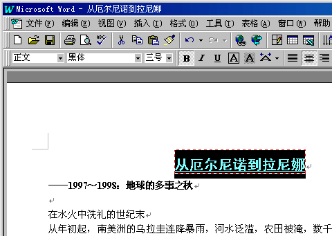 | 5.文字的对齐方式 “两端对齐”(又叫居中对齐)在Word中是默认的文字对齐方式,将所选段落(除末行外)的左、右两边同时对齐。 文档的标题通常都放在中间,署名通常放在一行的右侧。使用Word的对齐格式可以自动的实现。 比如将文档标题居中,就先选定标题,再单击“工具栏”中的“居中” 按钮。标题自动移动到此行的中间位置,即使重新调整页面的大小,标题始终会自动居中。其它的对齐操作也是如此。  同样选定文档最后一行“(摘自1998年第27期《海外星云》)”,然后单击“右对齐” 按钮,文字自动向页面的右边界对齐,  “分散对齐” 在Word中,通过调整空格,使所选段落文本的各行等宽。  回到页首 下一节 |