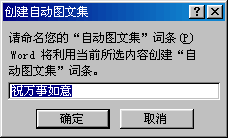 | 15.自动图文集的使用 在编辑文档时,可能需要输入一些特殊的符号,或使用一些常用语。 在编写信函或公文时,经常会使用到一些固定的词语,使用“自动图文集”可以很方便的输入这些常用词条。 我们写了封信,看看在自动图文集中有没有祝福的话。  将光标移动到信后面的插入位置,打开“插入”菜单,将光条移动到“自动图文集”,可以看到“自动图文集”的菜单项,如图A:(注意,此时“新建”一项不可选)  (图A) (图B) 其中提供了“信封用语”、“称呼”、“问候”等常用语。移动光条到“结束语”上,弹出的菜单下有中英文两种结束语,我们就选择“纸短情长,再祈珍重!”吧!(见图B)这样,这句话就插入到文章末尾了。  我们自己写的祝福的话,比如“万事如意”,也挺不错的,是不是也可以收藏在“自动图文集”中呢?当然可以,方法很简单,先选定它,然后打开“插入”菜单,仍然选择“自动图文集”,这时我们将会看到,图A中的“新建”已经变成了可选项[快捷按键是:ALT+F3],现在选择它;屏幕上弹出“创建自动图文集”对话窗,“名称”栏里已经填好了词条的名称,这里也可以重新定义一个名称。见下图:  然后点“确定”。这时在“自动图文集”菜单项下面将会增加一个“正文”项,其中就包含有这个词条名称。 那要想删除刚才添加的词条该怎么办呢?同样在“插入”菜单下选择“自动图文集”下的“自动图文集”,然后从词条列表中选择需要清除的词条,再单击“删除”即可。  回到页首 下一节 |