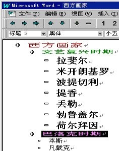 大纲视图 下面是我们上面曾编辑过的文章“西方画家”的草稿,它是一个按时期划分的列表,在上一分节中我们已经见到它在普通视图中的样子,可是我们希望可以看到各个时期和画家名字之间的一个层次关系,您也许会想到上面介绍的“项目编号”,这里我给您介绍一个方便的工具“大纲视图”,在大纲视图下可以很轻松的排列出它们的层次关系。 现在我们就切换到“大纲视图”,打开“视图”菜单,点击“大纲视图”,切换到大纲视图。 我们先从第一级项目开始,选定第一级标题“西方画家”(左下图),然后单击工具栏中的“升级” 按钮,此时在“样式”表单栏中显示出“标题1”(右下图)。  下面再选定“文艺复兴时期”,单击“降级” ,在样式栏中显示“标题2”(左下图);接下来再选定文艺复兴时期的所有画家,再单击“降级”,此时样式栏显示“标题3”(右下图)。  这时二级的标题“巴洛克时期”也变成了第四级别的了。 选定二级的标题“巴洛克时期”,单击两次“升级”,样式栏又显示“样式2”。 这样从样式栏中显示的级别或者从文字缩进的多少已经可以知道各个项目之间的关系。 使用相同的方法,我们可以将下面的各项目间的级别划分出来。 回到页首 下一节 |