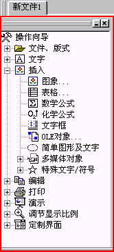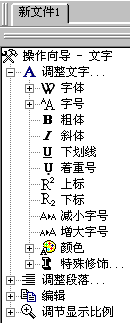 | 3.关闭和打开操作向导: 要关闭操作向导,可以点击操作向导右上角的关闭按钮,也可以从工具条快捷菜单(如左图)中取消操作向导前面的对勾标记。那么,如何打开操作向导呢?先打开“查看”菜单,把选择光条移到工具条上,在下级菜单中单击“操作向导”,使其前面出现对勾,就打开了操作向导。也可以直接在工具条上单击鼠标右键,从快捷菜单中选择“操作向导”。 4.改变操作向导的外观: 为了减小操作向导占用的屏幕面积,让有限的面积容纳更多的内容,您可以像操作Windows的一般窗口一样用鼠标拖动操作窗口的右边框 改变操作向导 的窗口宽度。还可以用下面的方法改变操作向导的外观:在操作向导的窗口内单击鼠标右键,在快捷菜单(如右图)中选择“字体”,可以改变操作向导中文字的字体字号,选择“不显示图标”,可以隐藏操作向导窗口中的图标。 5.如何使用操作向导: 操作向导的外观很像Windows的资源管理器,带有“+”标志的命令表示该命令集合还有下一级的子命令,用鼠标单击可以折叠或展开这些子命令。操作向导中的命令和功能都是菜单和工具条中能够找到的,但是它只包括与操作对象相关的命令。缺省的情况下,编辑窗口中的所有内容都被当作操作对象,所以这种情况下操作向导窗口中几乎包含了所有操作命令。但是当操作对象比较确定时,操作向导中显示的命令也就比较少而有针对性了。比如我们选定一个字,操作向导中就只剩下与文字有关的命令(如右图),与之无关的命令暂时被隐藏起来了。这使得我们可以很方便地直接从操作向导中选择命令进行相应的操作。 |