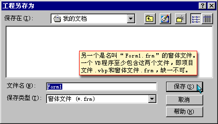 另一个是名叫“Form1.frm”的窗体文件。一个VB程序至少包含这两个文件,即项目文件.vbp 和窗体文件.frm,缺一不可。
