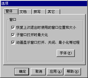 点击“窗口”选项卡上的“字体”按钮,我们可以象在记事本中设置藏书架中文档的字体(如右图)。 在“文档”选项卡的“文档默认显示位置选项框”中可以选择文档的内容是显示在第一页还是在第二页。 在“其它”选项卡的“杂项”中可以选择“书架打开时显示书架和文档的属性”。我们还可以在“拼写”选项卡中设置关于拼写检查的选项。 //shelf.533.net是专门介绍藏书架的站点,其中包括有藏书架的使用手册及下载。 | |||
