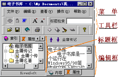 | 电子书库是一个运行在Windows95/98简体中文版下的32位程序,和readbook一样是免费下载的共享软件,它无须注册,如果您有兴趣的话还可以下载它的源代码。“电子书库”,顾名思义其强项是书目的管理,同时它也是一个不错的阅览器。有了它,您的家藏大作尽可以被打理的整整齐齐,翻阅起来有条不紊,非常方便。 ☆一、软件的安装和卸载 下载后的电子书库只有一个文件,Srmsetup.exe,双击此文件就可以运行,我们可以依据提示进行安装。软件给出的缺省目录为C:\stack room,可以进行修改。 如果不修改,可以点击“Unzip”,弹出“安装电子书库”画面,在这里可以修改注册表选项,比如设置是否将“电子书库”添加到右键菜单等,单击“安装”按钮,软件开始安装,一二秒种就完成了。如果不再需要“电子书库”了,可以在“控制面板”的“增加删除程序”项中找到并选择“ 电子书库”,将其卸载。 ☆二、认识电子书库的界面 在桌面上找到电子书库的小图标 并双击,软件就启动了。 图中你能看到电子书库界面的大致功能划分。 ☆三、电子书库的使用方法 好,下面我们就看一看怎样使用电子书库来管理你的书目。 ☆1.新建书库文件