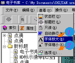 ☆4.编辑框的使用 经过一番整理,您的书库一定已经初具规模,而且摆放的井井有条了,下面你就可以打开书库,欣赏大作。单击标题框中的标题,文章内容便显示在右边编辑框中。 和NotePad差不多,在编辑框中单击鼠标右键,可以在弹出的菜单中进行复制、剪切、粘贴等操作。  如果你对阅览时编辑框内的背景色、文字颜色、字体及大小不满意,则按以下方法设置: 〈1〉单击“查看”,菜单弹出后,点击“字体放大/缩小”项,就能调整文章字体的大小(如左图);  〈2〉单击“查看”,菜单弹出后,点击“选项”,在出现的“选项设置”窗口的“显示”页中(如右图),可相应改变编辑框和标题框的背景色及文字颜色。 ☆5.设置书库文件口令 电子书库允许对书库设置口令,只有输入正确的口令才能访问该文章。设置书库口令的方法是单击标题框上面的“属性”,口令设置后下次打开书库必须输入口令,这样别人就不会进到你的书库里。同样编辑框上面的文章属性储存该文章的作者、口令、索引关键字和文章类型等信息。 ☆6.其他功能简介 <1>压缩空格 是为保存网上下载的文章而增加的功能,网上许多文章在每个汉字间都加有一上空格,压缩空格正是为删除这些空格而产生的功能。 <2>合并成段 很多HTML格式的文本转换成纯文本后格式就较为混乱,本功能能够将所选择的文本中所有的硬回车换行符给去掉,将选择内容合并成一段。 <3>BIG5->GB 本功能能实现将BIG5码转换成GB码,如果当前文本内码不是BIG5而用户使用了此功能,则系统也进行强行转换。 <4>获得帮助 您可以从“帮助”菜单中获得较为详细的电子书库软件的使用方法。 欢迎您下载并使用电子书库! 上一页 |