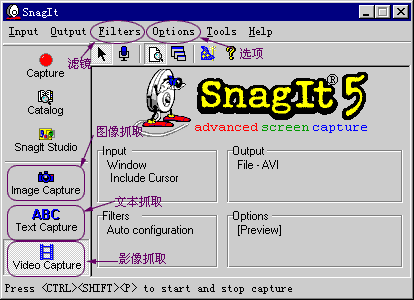 | 上网浏览时我们常常见到很多精美的图片,肯定你也想到过把他们抓下来,留待日后慢慢欣赏。您可能用过Hypersnap、GrabIt等抓图软件,现在我向您介绍另一款抓图好手SnagIt。它的主要功能包括图像的任意区域截取、文本抓取、影片中的影像抓取;同时它还可以对抓取后的图片进行编辑和一些特效处理。好了,下面我们就一步一步走入SnagIt的奇妙世界。 一、SnagIt界面简介 SnagIt的安装十分简单,只需按照提示一路“下一步”,最后“确定”就“OK!”了。下图就是安装后SnagIt启动的界面。 SnagIt的菜单栏中共有六项: Input:主要是选择图片抓取的范围。您可以在其中选择抓取全屏、窗口、特定区域、菜单等。您甚至可以选择在DOS模式下进行抓取图片; Output:主要是把抓取的图片传送到指定的地方,如打印机、剪贴板、文件夹、电子邮件等; Filters:滤镜。它可以对图片进行一些特效处理,如旋转、变形、调整色彩、亮度等; Options:选项。这里用来设置SnagIt的属性; Tools:工具。它实际上就是主界面左侧列出的一些快捷键,Capture是用来启动抓图的,Catalog是用来看图的,Snagit Studio是加强SnagIt的一个免费的共享软件,它会使你的图片看起来更专业化,但需要先安装才能使用;Image capture是进行图像抓取的;Text Capture是进行文本抓取的;Video Capture是进行影像抓取的; Help:帮助。 主界面右下侧的大片区域是实时的显示您正在进行的操作; 它分为Input、Output、Filters、Options四项。 下一页 返回到页首 |