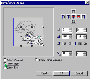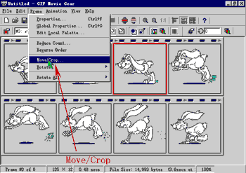 | GIF Movie Gear还允许我们对动画中的某一帧进行移动、旋转等处理。比如,要移动某一帧在画面中的位置,只需先用鼠标选中要处理的帧,然后点一下“Frame”菜单中的“Move/Crop”项。  在弹出的“Move/Crop Frame”对话框中,左面显示着这一帧的图案,图中有一个矩形的框,你可以用鼠标拖动来改变框的位置和大小,也可以在右边用具体的数值来进行设置,下面有几个复选框分别为: Show Previous:显示前一帧; Show Next:显示下一帧; Show First:显示第一帧; Show Frame Cropped:显示帧被切后的结果。  点“OK”后,这一帧就改变了。 帧的旋转方法也差不多,先选中要旋转的帧,再点“Frame”菜单中的“Rotate”项,再从它的下级子菜单中选择想旋转的角度: Rotate 180°:旋转180°; Rotate 90° CW:顺时针旋转90°; Rotate 90° CCW:逆时针旋转90°。  Flip Horizontally:水平翻转; Flip Vertically:垂直翻转。 比如我们选择“Rotate 180°”,瞧,这一帧改变了。 |