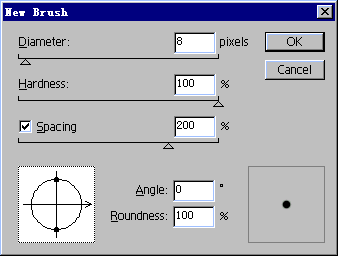 | 如何制作邮票? 预览成品:  逐步说明: 1、为了更好的显示效果,先把背景层的颜色设为桔红色。 2、单击文件菜单(file/open)打开一张图象,如图1。 3、按Ctrl+A选择画布。 4、单击图层菜单-新建-通过剪切的图层命令(Layer/new/Layer Via Cut),将选取区剪切到图层1,如图2。  图1 图2 5、在工具箱中选择矩形选框工具,在图象窗口建立略小于画布的选区。 6、单击选择菜单-反选(Select/Inverse),将选取反选。 7、单击编辑菜单-填充命令(Edit/fill)。在出现的对话框中设置用白色填充,单击“好”按钮,将选取用白色填充,如图3。 8、按Ctrl+D将选区取消。在图层调板中按Ctrl键,将图层1不透明区域作为选区载入。 9、单击路径标签,打开路径调板。在路径调板中单击“从选取建立工作路径按钮”(第四个按钮 用图 ),通过选区建立工作路径,如图4。  图3 图4 10、打开画笔调板,单击右上角的小三角,在弹出的下拉菜单中选择新画笔命令(Brush/New Brush),出现画笔选项对话框(如图5)。在对话框中设置直径为8,硬度为100% ,间距为200%。单击“好”按钮,画笔调板中出现一个新画笔。如图6  图5 图6 11、在工具象中选择橡皮插工具,在橡皮擦选项调板中选择刚才新建的画笔。在路径调板中单击“用前景色描边路径”按钮(第二个按钮 ),用前景色描边。 12、按键单击工作路径,关闭路径,看到效果了吗?如图7 13、单击图层标签,回到图层调板。单击图象菜单(Image),选择画布大小命令(Canvers Size),在出现的画布大小对话框中设置宽度百分比为110%,高的百分比为110%,定位于中间。单击“好”按钮,将画布扩大。 图7 14、设置图层1为当前层,单击图层菜单,选择效果,选择投影命令。(Layer/Effects/Drop Shadow)。出现投影效果对话框。设置距离为15,模糊为8,其余的为默认值。单击“好”按钮,效果不错吧?  图9 15、现在,我们来输入文字“80分”。在工具箱中选择文字工具,在出现的对话框中数字“80”的字体为“Monotype Corsiva”,大小为“30”个象素,颜色为“黑色”,文字“分”的大小为“15”象素,其余的为默认值,然后敲入文字,点击“好”按钮即可了。看看杰作吧,是不是很简单? 上一技巧(风吹效果) 下一技巧(如何制作漩涡字)  谈谈您的看法 |