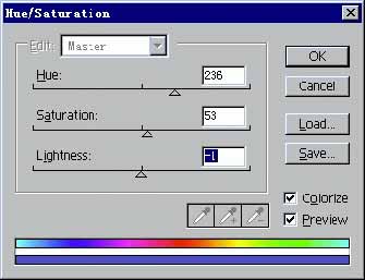 9、下面我们来调整闪电的颜色。单击图象菜单,选择调整,点击色彩饱和度(image>adjust>hue saturation),弹出的对话框如下,把colorize勾上,并按下图设置各个参数。按点击“ok”按钮。