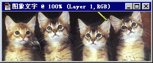 5、按住Alt键,将鼠标放在图象层Layer 1 和SWB文字层之间的实线上,当鼠标变成两个相互叠加的圆圈时,点击鼠标左键,此时你可以看到两层之间的实线下面出现了一条虚线,文字层的的名字中多了一条下划线。猫的图象缩进了文字里,如下图。