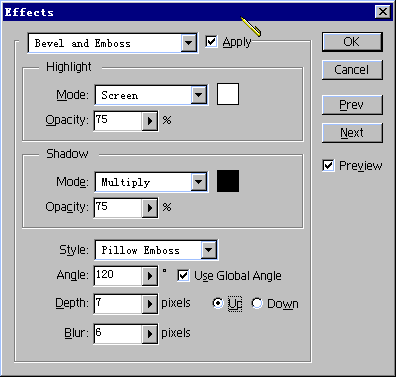 6、现在我们做一下效果,在图层面板中用鼠标右键点击文字层,在弹出的菜单中选择效果Effect,在弹出的对话框中按如下图设置。点击“ok”按钮,图象产生浮雕效果。即得到预览图效果。