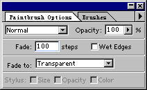 12、在“Layers”面板的标签中激活“Paths”面板,单击下面的 13、双击减淡工具 14、在“Brush”面板中选择标号为35的模糊圆形,在图象中的下节点单击数次,使路径的下节点变成一个发亮的光团。在“Paths”面板中的任意区域单击隐藏路径。看见了吗?一棵流星已经做好了。
