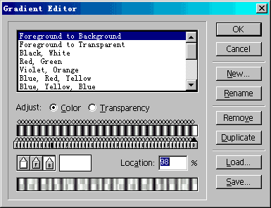 图 1 6、在“Adjust”且域中设置“Transparency (透明)”项,这时颜色编辑条就变为透明编辑条。渐变色块为黑色,表示“Opacity(不透明度)”为"100%”,渐变色块为白色。,表示“Opaciiy(不透明度)”为“0%"。单击左侧的渐变透明设置块,在“Opaeiiy (不透明度)”中输入“0”,然后将右侧的黑色渐变透明设置块至“2%“的位置。 7、按下 Alt 键的同时拖动左侧白色的渐变透明块至“7%”的位置。,用同样的方法以“7%”的间隔复制黑色和白色的渐变的透明块,如上图1。最后按“OK”钮退出渐变编辑对话框。 8、此时的渐变设置如下图: