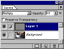 10、 在“Layers”图层面板中设置“Layer1”图层的合成模式为“Multip1y(乘)”,设置“Opacity(不透明度)”为“60%”。