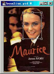 6、 此时你可以看到女孩头像的大小以及角度都不太匹配,必须调整一下,否则安上去就变成大脑袋歪脖子了。点击菜单“Edit > Free Stransform”(编辑-自由变换)或者按快捷键Ctrl+T键,在头部会出现一个调整框,按住Shift键用鼠标拖拉调整框的端点进行调整头像的大小,然后把鼠标放在调整框的四个顶角的外面,当鼠标变成拐弯的箭头时,就可以调整图象的角度了,调整满意后直接按回车即可,并用移动工具移到适当的位子,如图。