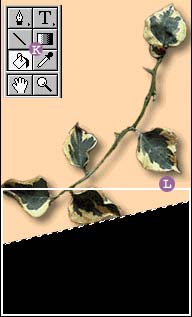 7. 制作背景和记录选择范围 现在我们给图片做个好看温馨的背景色,单击工具箱颜色板的前景色,先把中间竖着的基色条拖到桔红区域,然后在左边的大色盘中找到一种柔和的橙黄色,我们这里选择的颜色数值是R红色255,G绿色214,B蓝色166,单击OK,单击背景图层,使之成为被编辑层。选择颜料桶工具(K),在图像中任意处单击,橙黄色会填充整个画面,再使用绳套工具,按住Alt键,在树叶底部画出一条贯穿的斜线(L),将下半部分都包括在选择范围内;改用颜料桶工具,将前景色改为黑色,在选择范围内单击,这样,黑色就填充了背景图层的下半部分。