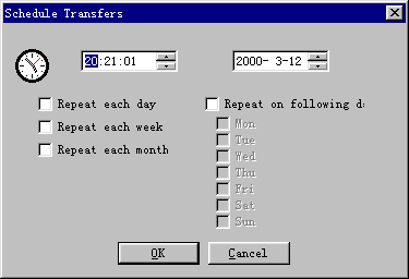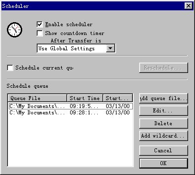 4、制定文件传输计划 现在的网络传输速度一般是白天比较慢,午夜尤其天亮左右时,由于上网人数较少,网络传输速度相对较快,可是我们又不想熬夜。怎么办?这时可以设定文件传输计划,CuteFTP会按照这个日程进行运作。下面我们就说一说如何定制文件传输计划: 如何将队列文件添加到计划中去?