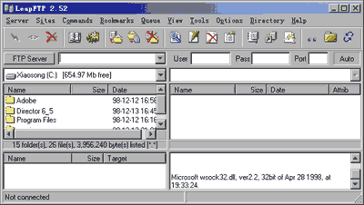 这就是它的界面了。上面两排是菜单栏和工具栏;下面分为四个窗口,左上方是本地窗口,它代表你的硬盘,这里显示的是你硬盘上的目录和文件;右上方的是远程窗口,这个窗口代表你想要登录的服务器,里面显示的是这个服务器上的目录和文件;左下方的窗口是我们给LeapFTP发出的命令的队列,也就是说,我们发出的命令会在这里按顺序排列着,然后一个一个挨着执行。这个功能使得我们可以一次向它发出很多命令,然后让它自动去做。这样可以节省我们很多时间。右下方的窗口中记录了我们在登录这台服务器时的详细信息。