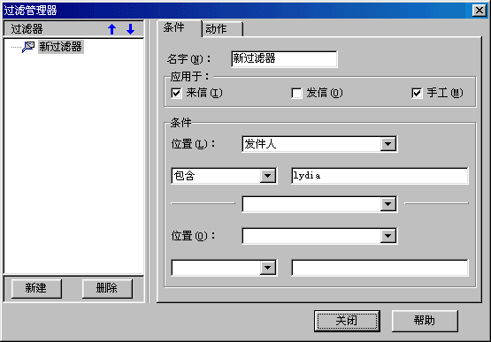 ☆9.过滤器 如果您接收的邮件数目较多,希望将收到的邮件自动地保存到不同的邮箱中时,就要用到“过滤器”了,它可以按我们定义的规则,将收到的信件自动的分类保存在相应的邮箱中。点“帐户”菜单下的“过滤器”,这就是“过滤器”窗口,我们点“新建”来编辑一个新动作。上面这些是条件,下面的“转移到”是动作。在这儿,我们可以根据邮件的发件人、收件人、抄送和主题来定义对收到的邮件所采取的规则。例如,我们定义一个规则:当来信的发件人是“lydia”时,转到“网友们的信”邮箱中。这样,你只要在“动作编辑”窗口中的“发件人”中写上“lydia”,再在“转移到”中选择“网友们的信”就可以了。