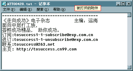 | 10、阅读邮件中的附件 现在我们看看怎样打开邮件中的附件。 收到信后,在“收件箱”的邮件列表中选择此邮件,这时,在下面的“预览窗格”的蓝色标题栏上可以看到一个“曲别针”,表示这封邮件包含有附件。 点一下“曲别针”,出现附件选择菜单,其中列有附件的名称,点一下附件的名称; 如果附件是执行文件,或者HTML文件,或者其他具有危险性的文件,Outlook都将弹出了“警告”提示,这一点很重要,当我们收到一封来历不明的邮件包含有附件时,一定要小心,有可能里面就是一个病毒。如果你对这样的邮件放心的话,可以点“打开”来阅读附件。 如果附件不具有危险性的话,则附件直接被打开。