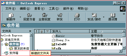 | 13、建立文件夹 如果收到的邮件越来越多,收件箱里堆满了信,管理起来岂不是很麻烦? Outlook 已经考虑到了这一点,我们可以建立不同的“文件夹”,也就是目录,把来自四面八方的信件分门别类的放在各个“邮件”夹中。 比如我们可以建立文件夹(目录)“朋友的来信”,专门用来存放朋友们的信件。在右边的Outlook Express上单击鼠标右键,选择快捷菜单中的“新建文件夹”;屏幕上出现一个对话框,这时我们输入文件夹名称“朋友的来信”,在下面的选择框中选择新文件夹创建的位置;比如这里我们就选定“收件箱”,然后按下“确定”返回。 这时可以看到,左侧的“收件箱”中便出现了“朋友的来信”。