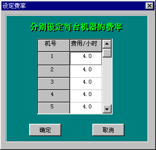 “最小计费时间单位”:比如填 30 分钟,则程序会做以下解释: 1>开始运行不足半小时的按半小时计费。 2>运行了50分钟,则因为(50-30分钟) > (30分钟/2),所以按一小时计费。 3>运行了65分钟,则因为(65-60分钟) < (30分钟/2),所以按一小时计费。 4>运行了80分钟,则因为(80-60分钟) > (30分钟/2),所以按一个半小时计费。 “最小计费金额” 收费的最小标准。 “注意”:“最小计费时间单位”和“最小计费金额”会互相作用,如果只想“最小计费时间单位”起作用,只要把“最小计费金额”设置为0.1元即可。 如果只想“最小计费金额”起作用,将“最小计费时间单位”设置为1分钟。程序缺省设置“最小计费时间单位”是10分钟,“最小计费金额”是1元。 “限时时间到时需要提示”:选中后,当限时到时提示你是否要延时。没选中时,当限时到时什么也不提示,直接停止此机。