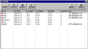 | 美萍网管大师 |  | | 一、软件简介 二、软件安装 三、网络配置 四、软件注册 五、界面介绍 六、系统设置 1、密码设置 2、计费设置 七、网络管理 1、基本管理 2、收费管理 3、会员管理 4、商品管理 5、锁定屏幕 八、查看记录 | | 七、网络管理 3、会员管理 在“美萍软件设置”窗口中选择“管理”选项卡,进入到管理窗口。点击“系统会员管理”按钮,进入到“会员管理”窗口。  对会员的管理包括以下几个方面的功能: | 新增用户 | 点击“新增用户”按钮,在“用户添加”窗口中按照窗口的提示,填入新用户的资料,确定后加入到用户列表中。 | | 资料修改 | 点击“资料修改”按钮,在“用户修改”窗口中可以修改用户备注信息。 | | 查找用户 | 点击“查找用户”按钮,在“查找”窗口添加查找对象,然后确定进行查找。 | | 添加金额 | 选中某一用户,点击“添加金额”按钮,弹出“为XX用户添加机时”窗口,在窗口中填入要添加的机时数,确定。 | |