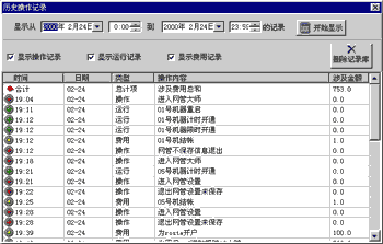 在“美萍软件设置”窗口中点击“操作历史记录”按钮,弹出“操作历史记录”窗口。在该窗口中输入要显示的开始时间和结束时间后,点击“开始显示”按钮,我们可以看到该一时间段内的操作记录、运行记录和费用记录。