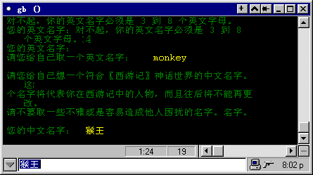 | | 接下来要再给自己取一个中文名字。 选择一个名字后,您需要设定自己的密码。“西游记”对密码的要求是比较严格,您的密码不能少于五个字符,有些系统对密码的要求更严格,密码中要包括大写、小写字母和数字以及特殊符号(@、#、*等)。虽然麻烦一些,却也并非毫无必要。如果密码设得太简单,自己的角色就可能被别人盗用,那时发生的事多半会让您欲哭无泪的。 在您设好一遍密码后,系统会让您再输入一次密码,以确认您没记错。您可一定要记住自己的密码,否则,下次您就不能再用这个角色接着玩了。然后系统让您输入自己的电子邮件地址。通过它,巫师们可以与玩家联系。这一项也可以不填,直接按回车就可以。 |