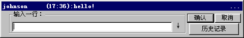 在“行输入功能”窗口中写好要说的话,再回车,消息马上发出去了!而且,速度也比在线编辑快许多。 这种方式最大的好处在于,所有我们用“行输入功能”写的消息在硬盘上都保存有历史记录。没有用“行输入功能”回答的问题是没有记录的。我们可以选择“工具”\“查看通话记录…”来查看这些记录。 用鼠标单击“工具”菜单下的“查看历史记录”,如果你想看“Johnson”和你的对话记录,就选择Johnson_msg.txt文件,点“打开”按钮,这样,通话记录就打开了。