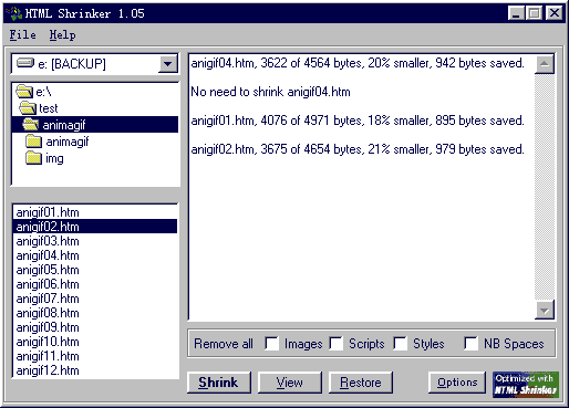 假定我们要对anigif02.htm文件进行“减肥”,首先我们在目录列表中e:\test\animgif目录,在文件列表框中选择anigif02.htm文件。然后点击Shrink按钮,在文本框中会显示“减肥”过程,并给出结果。上图给出了对anigif02.htm的减肥结果,原来4654字节的文件经过“减肥”后只有979字节了。 经过“减肥”后,结果文件自动存储,但是原文件也不会被删除,它以.bak文件的形式保存下来。如果再一次按“减肥”按钮,对一个大的HTML文件,可能会进一步减小文件大小,但是对一个小的文件,可能并没有什么效果。 |