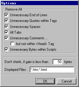 在主界面中点击“Options”按钮,我们便可以对“Remove All”项进行设置(见下图)。在这里我们还可以设置HTML Shrinker进行操作的最小文件大小。比如这里设置为50字节,意思是当文件大小小于50字节时,软件不对文件进行“Shrink”操作。