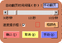 在右键菜单中选择“自动翻页”,弹出的对话框中可以设置自动翻页的时间间隔,最短为30秒钟,最长为10分钟(如上图所示),我们可以根据自己的阅读速度选择合适的时间间隔。