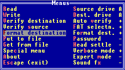 | ☆3.映像文件 如果而手头上没有软盘的话,该怎么办呢?岂不是急死人了! 没关系,把刚才读出来的数据做一个IMG的映像文件,存放到硬盘上就行了。 等你有了软盘后,再写到软盘上。 将光标移到“Put to file”上回车,在最下面一行出现光标闪动,输BOOT.IMG, 回车, “Transfer to file ok”表示数据保存完毕。 这个文件就象是将软盘的格式、数据做了一个镜像, 以后可以通过HD-COPY把它再写到其它软盘上,这样,那张盘上的数据就完全保存下来了,而且跟以前的那张软盘是一模一样的,没有丝毫的变化。 那又怎样把这个文件读出来呢? 将光标移到“Get from file”上回车, 输入文件名BOOT.IMG, 回车,  放一张盘到软驱里, 将光标移到“Write”上, 敲回车就开始写到软盘了。 ☆4.格式化软盘 用HD-COPY格式化软盘,能收到意想不到的结果。 它最显著的特点就是,格式化磁盘的速度快,而且质量较高。 对于那些有问题的软盘,HD-COPY能不断在有坏道的地方读取、初始化,所以能保证磁盘格式的质量。 现在,低密、单面盘已经不复存在,能见到的差不多只有3.5寸盘,一般容量为1.44MB。 所以我们只需要将它格为1.44MB就行了。 将光标移到“Format destination”上回车, 找到“HD standard,18 sect,1.44MB”回车, 就开始格式化软盘了。 ☆5.维护软驱 当计算机用了很久后,软驱的磁头上会因为积满了灰尘,而读不出数据,在很大程度上,这也是损坏软盘的一个原因。我们可以通过使用软驱清洗盘来清洗软驱磁头上的灰尘。 将清洗盘插入软驱。将光标移到“Special Menu”上回车,再移到“Use Cleaning Disk”项上回车,HD-COPY开始清洗软驱了。  把你刚才没能读出的盘放进去试试,有什么发现?数据读出来了 ☆6.看文件列表 有时候在用HD-COPY读了一张软盘后,却记不清楚里面的内容是不是我们所需要的,又要退出HD-COPY,再敲DIR也是很麻烦。有没有办法直接看到它的文件列表呢? 当然有了, 把光标移到“Special menu”上,回车, 再移到第五行“Display directory”,回车,你看,文件名就列出来了,还能看到文件名的属性呢。  关于HD-Copy就介绍这么多,如果您还是很眷恋DOS,就请下载吧,它将对您有很大的帮助。 上一节 |