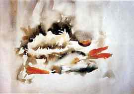 逐渐向外扩展涂色的范围,画出胡萝卜、两条鱼的色调,这一步的水分与颜色要适当地饱满一点。