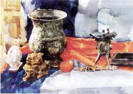 对物体作深入的描绘。 如青铜器物上的图案和色彩的变化的刻画表现,既要注意细节又要保持它的整体感。同时对红布夜要作深一步的描画,作品就完成了。深入的过程中,同时对画面作整体上的调整。