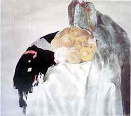 进行调整,白衬布的布纹着强调一下,该加重的加重。水果集中在盘子里,但其前后应从色彩上给于区别。整个画面整体的黑白灰关系明确,构图和色彩都非常稳定。
