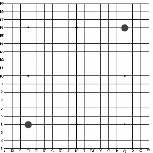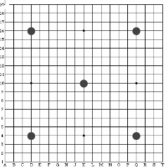 2:棋具: (1) 棋盘: 棋盘纵横十九条线,棋子要下在线与线的交叉点上,方格中不能放入棋子。交叉点的数目是19*19=361个。为了便于识别棋子的位置,棋盘上划了九个点,术语称做"星",中央的星点又称为"天元"。下让子棋时,所授之子要放在星上。棋盘可分为九个部分:四个"角",即左上角、左下角、右上角、右下角;四条"边",即上边、下边、左边、右边;角、边以外的地方就是"中腹"。