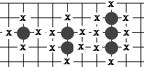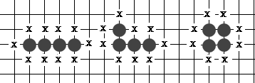 见右图:同样是四个连接在一起的黑子,左边的四个黑棋有十口气,中间的黑棋只有九口气,而右边的黑棋仅有八口气,这是因为右边的四个黑子凝集在一起,互相之间把气堵塞住了;而中间的黑棋只有两子互相之间堵塞住一口气;左边的黑棋气口畅通,生命力最强。因此我们下子时也注意不要把棋子挤在一块,以免堵塞住棋子的气。