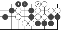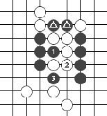 (图38) 图39:白方先紧气,自白1到白3,白方先把两个黑子吃掉。