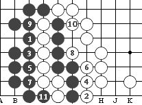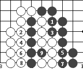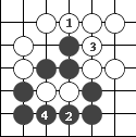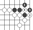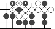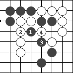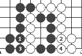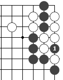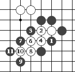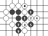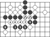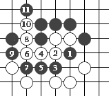 (图9) 如图10,黑1门吃三个白子是正确下法。如果白2长,黑3提白四个子,成为图11的形状。这时白可下1位回提一子,叫"提四还一"。