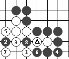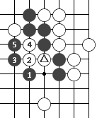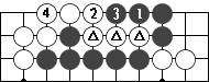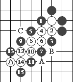 图14的 黑1打吃,当白2长时,黑6即可抱吃白三个子。这样才能解救两个△号黑子。
