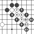 如图13,黑下1位即可吃住这一个白子。像黑1这样类似伸出一只手把对方子抱住的吃子着法叫"抱吃"。