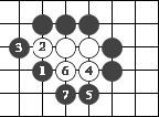 图36:黑1长,白2冲,黑3长,白4再冲,黑5再长,准备门吃白两子,白只好下6位,这时黑7连回。被围的三个黑子就逃出了。